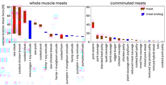 Figure 4 summarizes the reported Warner–Bratzler shear force values across several studies for a wide selection of whole-muscle and comminuted meats and meat analogs. Here, we only included results where the test was specified as the Warner–Bratzler shear test and excluded other puncture-type tests. The products are arranged from the maximum reported Warner–Bratzler shear force to the minimum, from left to right. When a range of values is reported, depending on factors such as production type, sample to sample variation, different compositions of the meats, or cooking time, the bar graphs report the whole range. Whole muscle meat references include raw steak [,], cooked chicken breast [,,], cooked steak [,], microalgae and soy extrude [], raw pork [], cooked pork [], hemp and soy extrude [], raw chicken breast [], hemp and mungbean extrude [], cooked ham [], pumpkin and mungbean extrude [], hemp extrude [], pumpkin and soy extrude [], pumpkin extrude []. Comminuted meat references include pork salami [], pork sausage [], blended beef patty [], quail sausage [], lamb sausage [], veggie burger [], chicken sausage [], chicken patty [], plant sausage with psyllium [], reduced meat sausage [], cooked beef patty [], meat-free sausage [], minced pork steak [], textured soy protein patty [], minced hybrid steak [], tofu [], cooked pork patty [].
