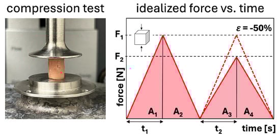Texture profile analysis is another popular method to characterize the mechanical properties of meats which are well correlated to sensory tests [,]. It consists of a double compression test at rates approximating chewing speed [,]. The double compression tests are performed at a fixed amount of compression, typically between and peak strain. We can directly determine hardness, springiness, adhesiveness, cohesiveness, brittleness, gumminess, and chewiness from the recorded force versus time and deformation versus time curves [,,]. These parameters are derived from the peak forces of the first and second loading cycles and , the associated loading times and , the areas under the loading paths and , the areas under the unloading paths as and , and the peak stress , where A denotes the specimen cross-section area []. We have summarized the most common calculations for the main parameters in Table 2. While easy to perform, this test method suffers from lack of standardization, inconsistent definitions of the output parameters, and user confusion over mutually exclusive parameters like chewiness for solid foods and gumminess for semi-solid foods [,,].