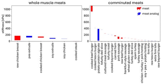 Figure 6 compiles reported stiffness values for meats and meat analogs from either single compression tests or double compression texture profile analysis. As we have discussed, this comparison is limited by the different rates of testing in different studies. Yet, it provides a first glance at the different stiffnesses between whole, comminuted, animal-based, and plant-based meats across multiple studies. Whole-muscle meat references include raw chicken breast [,], pea extrude [], cooked chicken breast [], soy extrude [], chick’n [], cooked steak []. Comminuted meat references include cooked beef burger [], cooked tesco burger [], potato protein alginate [], tufurky deli slice [], cultured meat sausage [], tofurky roast [], cooked beyond burger [], canned ham [], podwawelska sausage [], raw beef burger [], sausage [], plant sausage [], turkey deli slice [], spam turkey [], turkey sausage [], hotdog [], plant hotdog [], firm tofu [], raw tesco burger [], extra firm tofu [], raw beyond burger [].