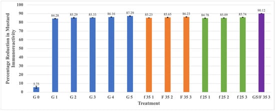 Percentage reduction in mustard protein immunoreactivity of germinated and fermented mustard seeds. The notations are detailed in Table 1 (G0–G5 for germination and F35,25 1–3 for fermentation); Different colors represent different groupings.