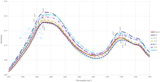FTIR—spectra of Amide I and II components of raw and germinated mustard seeds. The notations are detailed in Table 1 (G0–G5 for germination).