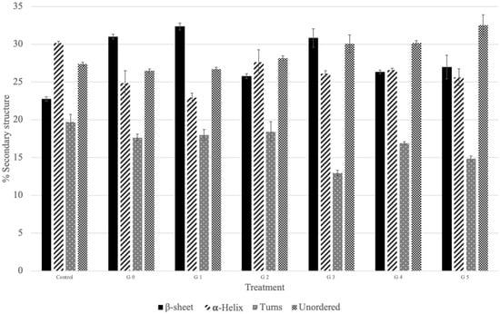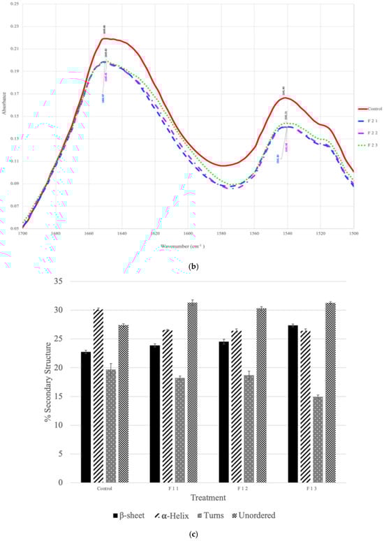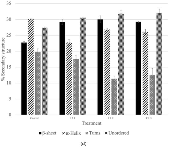 Figure 4a represents the FTIR spectra for the ecombined treatment of 5-day germination followed by fermentation at 35 °C for 3 days and raw mustard seed samples. Major variations in the Amide I and Amide II regions were observed when both germination and fermentation methods were applied to yellow mustard seeds. The secondary structure changes obtained from the FTIR results for mustard seeds samples treated with both processes, germination and fermentation, are shown in Figure 4b. Comparing the combined treatment samples that germination for 5 days followed by fermentation (35 °C) for 3 days resulted in the largest increase in percentages of α-helices and turns, and decreases in β-sheet and unordered structures. Therefore, the FTIR results show that the secondary structure of mustard proteins are sensitive to biological processing methods. These treatments are promising methods for bringing changes in the secondary structure of mustard proteins. Hence, the combination treatment is more beneficial than the individual one.