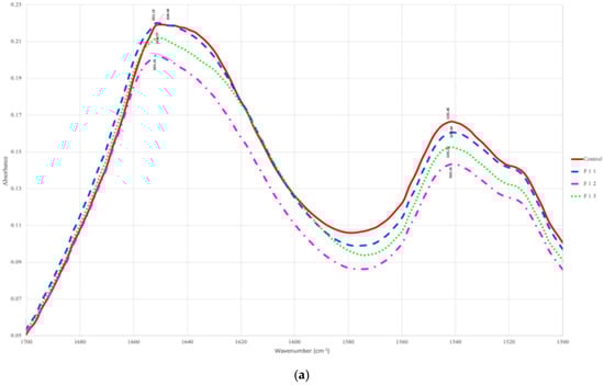 Fourier-transform infrared spectrometry (FTIR) analysis is certainly one of the most important analytical techniques for studying conformational changes in the Amide I and Amide II regions of processed samples. The Amide I and Amide II regions are most important for interpreting the vibrational bands of protein backbones []. To study the protein secondary structure changes that are conformational changes (folding and/or unfolding of protein and formation of aggregates), Amide I region deviations in the infrared spectrum are used []. This region is associated with the C=O stretching of the peptide backbone and N-H bending vibrations []. Amide I comprises overlapping bands of a number of secondary structures that are β-sheets, α-helices, turns, and randomly coiled conformations []. Deconvolution of Amide I bands isolated each band and differentiated its frequency to determine the right secondary structure components and quantify them [,]. The Amide I region bands are assigned to β-sheets (1613–1637; 1682–1696), α-helices (1645–1662), turns (1662–1682, 1630), and unordered (1637–1645) []. The typical FTIR spectra of the Amide I and Amide II regions of raw and germinated mustard seeds are shown in Figure 2.