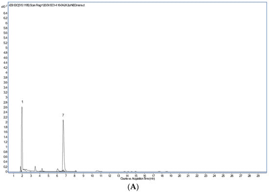 Extracted ion chromatogram of major polyphenol compounds detected in the coffee cherry pulp extract. (A): compounds detected after operation in the positive ion mode. (B): compounds detected after operation in the negative ion mode.
