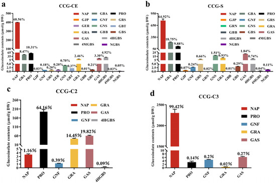 The crude GSL extracts from Chinese cabbage seeds were isolated and purified using an acidic alumina chromatography column eluted by 0.1 M KNO3 to obtain purer glucosinolate extracts. The elution solution (7–21 tubes) was collected, and the purity of the fraction CCG-S was 67.1%, which was 1.13 times higher than crude extracts of glucosinolates (CCG-CE) (p < 0.05). On the other hand, the crude GSL extracts were isolated and purified using preparative liquid chromatography. As shown in Figure S1A, seven fractions (C1-C7) were collected. The purities of CCG-(C1-C7) are shown in Figure S1B. Among all of the collected fractions, CCG-C3, CCG-C4, and CCG-C5 had higher purities, with 99.6%, 71.3%, and 64.4%, respectively. The research on the pharmacological activity of glucosinolates and associated metabolites has been severely hindered by the absence of easily available analytical standards [20]. Liquid–liquid partitioning and conventional column chromatography were typically utilized for the purification of glucosinolate crude extracts [21]. Glucosinolates could be significantly purified using column chromatography given that they were electronegative due to their sulfate groups [20]. Based on the differences in R-side chain groups, glucosinolates could be further isolated by utilizing stationary phases with various affinities and mobile phases [22,23]. Preparative reversed-phase liquid chromatography has been the most common method for the isolation of intact monomeric glucosinolates [23]. In our study, the purity of CCG-C3 reached 99.56%, demonstrating that preparative liquid chromatography was an effective approach for isolating glucosinolates.