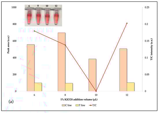 The pH reaction levels were crucial to the effectiveness of AuNPs–Abs conjugates. Theoretically, the pH of the reaction is supposed to be moderately elevated over the isoelectric point of protein. Below the isoelectric point, antibodies may clump together, causing AuNPs–Abs to clump together and precipitate. This would lower the accuracy and cause false negatives. Above the isoelectric point, the adsorption action is limited by charge repulsion between the AuNPs and the antibodies. This makes the test strip lighter in color. Based on signal intensity and sensitivity (Figure 4), the best pH for the AuNPs solutions was 7.8, which was reached by adding 9 µL of 0.1 M K2CO3 solution. The dimensions and concentration of AuNPs also influence the interaction between the antibody and the target analyte under investigation. According to the findings of the tests, the suitable concentration of AuNPs was 2:10,000.