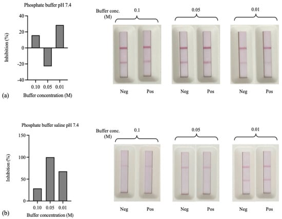 This study revealed that selecting a resuspension buffer affects the stability of AuNPs–IgY antibody conjugates. We evaluated multiple buffers, including phosphate buffer (pH 7.4), phosphate buffer saline (pH 7.4), borate buffer solutions (pH 8.0), and citrate–phosphate buffer (pH 6.6) for 0.1, 0.05, and 0.01 M in each buffer to assess their impact on conjugate stability and assay sensitivity. The results showed that formulating the AuNPs–Ab conjugate with an antibody concentration of 1 µg/mL achieved optimal sensitivity for the immunochromatographic strip test, as shown in Figure 7. The AuNPs–IgY antibody conjugates had the highest inhibition rate on the strip test when PB was used as a resuspension buffer. This means they were most stable. The 0.01 M phosphate buffer solution at pH 7.4 exhibited superior stability and sensitivity for the AuNPs–Abs conjugates. We selected this buffer as the resuspension solution to prevent coagulation and maintain test efficacy.