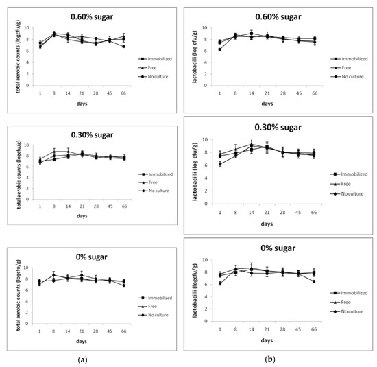 Lactobacillus casei ATCC 393 has been previously incorporated into food products [7,19,20,23] to confer probiotic properties [2,24,25] due to its acid-tolerant nature and activity against food spoilage and food-borne pathogenic microorganisms. Importantly, cell immobilization resulted in significantly increased survival rates over free cells during heat-treatment of dry-fermented sausages [19], as the probiotic cells were detected above the minimum levels required for conferring a beneficial effect using strain-specific multiplex PCR [19]. Likewise, immobilized L casei ATCC 393 cells were proposed as a protective shield against spoilage of probiotic dry-fermented sausages [20]. However, the effect of the initial sugar concentration on the quality characteristics and the shelf-life of probiotic dry-fermented sausages containing free or immobilized L. casei ATCC 393 cells was not studied.