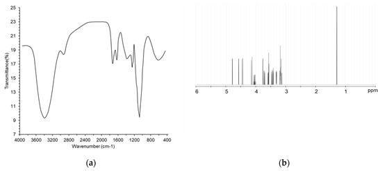 The integrated structure of MESP was further assessed via FT-IR and 1H and 13C NMR. The typical FT-IR spectrum of MESP in the 400–4000 cm−1 range is presented in Figure 2a. The graft MESP revealed strong stretching peak at 3397.8 cm−1 corresponding to the hydroxyl groups (O-H) [20]. The weak absorption peak at 2919.2 cm−1 was characteristic of C-H asymmetric stretching vibration [21]. The bands at 1736.2 and 1629.6 cm−1 might be due to the nonsymmetrical vibration of C=O in the ester group [22]. Moreover, the absorption signals at around 1473.3 and 1074.1 cm−1 indicated the presence of residual water (OH-). Furthermore, the signal observed at 1256.3 cm−1 was attributed to the stretching vibration of C-O. Collectively, FT-IR analysis suggested that MESP possessed typical sugar groups.