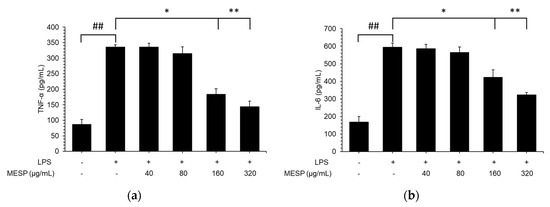 The NO levels were markedly induced after treatment with LPS alone, whereas they were remarkably inhibited by MESP pretreatment in a dose-dependent manner (Figure 3c). As 160 μg/mL MESP did not present any cytotoxic effect, we propose the possibility that inhibition of NO production was not linked to the cytotoxic effects on RAW264.7 cells.