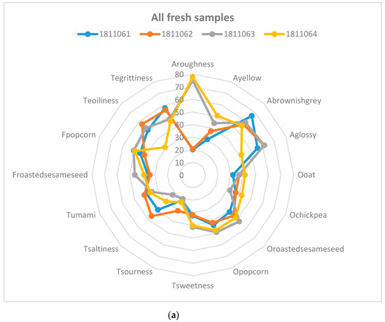 All the insect food samples were analysed during the same week. Figure 2 shows the sensory attributes of (a) fresh samples and (b) after 6 months of storage. In both fresh and stored samples, the particle size in the attribute “appearance of roughness” was detected, where samples 3 and 4 were perceived as having a statistically significantly higher roughness and also contained the coarsely chopped mealworms. The two samples with higher salt content, samples 1 and 2, were also perceived as significantly saltier. Samples 2 and 3 were perceived as having a significantly higher degree of oiliness, which became more apparent after 6 months of storage. These two samples had a higher oil content. During storage, the odours and flavours of popcorn and roasted sesame seed decreased significantly in all four samples. The decrease was largest at the beginning of the storage.