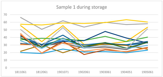 Packaged samples were stored at an ambient temperature of approximately 21 °C. The samples were retrieved 7 times, first directly after preparation and then each month for 6 months, and then put into a freezer (Vestfrost solutions VTS 098, Esbjerg, Denmark) and kept at −80 °C until analysis. All samples were thawed before analysis and analysed at the same time. The samples were labelled as shown in Table 3.