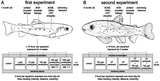 The experiments were conducted in two runs. Brown trout were exposed to defined amitriptyline and particle concentrations in a semi-static three-block design (triplicates) for three weeks in each run. Experiments took place in a thermostat-controlled chamber set to 7 °C and a light/dark cycle of 10/14 h. Glass aquaria with 15 L test media were placed in randomized order in each block to account for potential confounding factors. Each tank was equipped with a glass pipette connected to compressed air via silicone tubes for aeration and shaded from direct light. Per tank, 10 fish were exposed (thus 30 fish per treatment group). Trout were fed daily approximately 3% of their body weight (0.8 mm size, Incio Plus, Biomar, Brande, Denmark). A total of 50% of the water was exchanged twice a week. Amitriptyline stock solutions were freshly prepared immediately before the water exchanges. Vials containing MP stock suspensions were rinsed four times to avoid incomplete transfer of particles. To adjust the final amitriptyline and MP concentrations, stock solutions and stock suspensions were diluted with filtered and aerated tap water (after pretreatment with iron filter, particle filter, and activated carbon filter; Filwatec, Bad Liebenzell, Germany). Mortality and abnormal behavior were recorded daily, and dead fish were removed immediately.