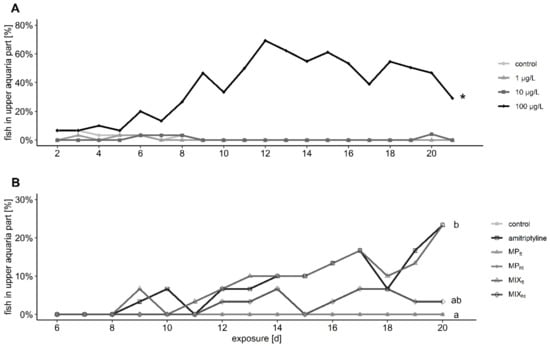 Percentage of fish present in the upper half of the aquaria during the exposure to different amitriptyline concentrations in the first experiment (A) and the second experiment (B) to amitriptyline or 104 particles/L PS MP (MPtt), 105 particles/L PS MP (MPht) or the mixtures amitriptyline + 104 particles/L (MIXtt), and amitriptyline + 105 particles/L (MIXht). 2 (A): Significant differences towards the control group are indicated with an asterisk. 2 (B): Significant differences between the treatment groups are displayed with different letters. Further statistical information is provided in the Supplementary Table S7.