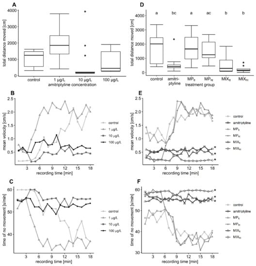 Results of the video tracking analysis. In plots (A–C) the results of the first experiment are depicted, in plots (D–F) the results of the second experiment (MPtt: 104 particles/L PS MP; MPht: 105 particles/L PS MP; MIXtt: amitriptyline + 104 particles/L; MIXht: amitriptyline + 105 particles/L). The boxplots display the median, the 25th, and 75th percentiles as well as minimum and maximum values (whiskers) whereas dots indicate outliers. Significant differences towards the control group (complete recording time) are indicated by asterisks. Significant differences between the treatment groups are indicated by different letters. 3 (B,C): Significant differences between the control group and 10 µg/L as well as 100 µg/L amitriptyline occurred at the end of recording time. Further statistical information is provided in Supplementary Table S7.