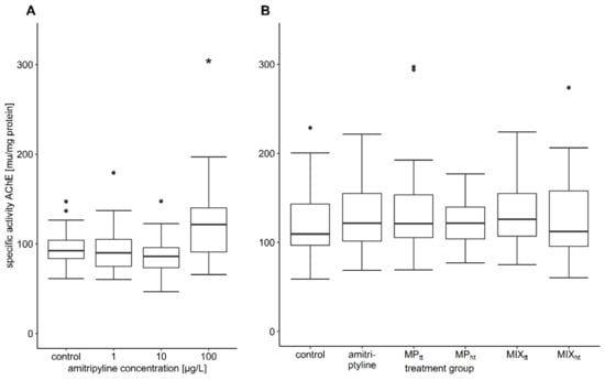 Specific activity of AChE. (A) first experiment: control n = 25, 1 µg/L and 100 µg/L amitriptyline n = 24, 10 µg/L amitriptyline n = 26; (B) second experiment: all treatment groups n = 30 (MPtt: 104 particles/L PS MP; MPht: 105 particles/L PS MP; MIXtt: amitriptyline + 104 particles/L; MIXht: amitriptyline + 105 particles/L). In the boxplots the median, the 25th, and 75th percentiles as well as minimum and maximum values (whiskers) are displayed; the dots indicate outliers. Significant difference compared to the control group is indicated with an asterisk.