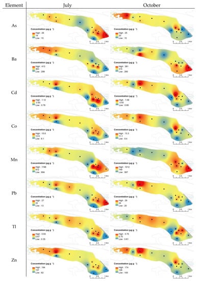 Moreover, it is worth mentioning that V, Cr, and Mo presented higher concentrations in the feeding zone in both sampling sessions, with the higher concentration area being broader in October compared to July.