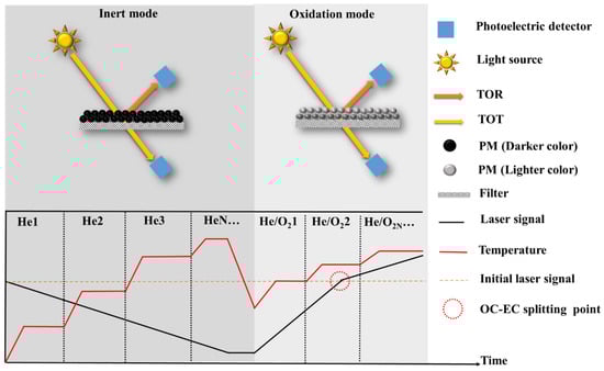 The presence of PC affects the quantitative accuracy of OC and EC by influencing the timing of OC-EC split points. Premature splitting leads to an overestimation of EC and an underestimation of OC, while delayed splitting results in the underestimation of EC and the overestimation of OC [,]. Optical correction techniques, such as the thermal optical reflectance method (TOR) [] for reflected light and the Thermal optical transmittance method (TOT) [] for transmitted light (T), are employed based on temperature programming to monitor PC formation and evolution, thereby determining the accurate split point between OC and EC. The optical correction principle involves measuring changes in laser signals irradiated on the filter to indicate variations in filter darkness. An increase in darkness causes a decrease in the optical signal, signifying PC formation, while a decrease in darkness corresponds to an increase in the optical signal, indicating PC and/or EC evolution. The moment the optical signal returns to its initial value marks the split point between OC and EC (Figure 2). It is important to note that the accuracy of optical correction relies on two fundamental assumptions: (1) PC evolves before EC, and (2) PC and EC possess identical optical properties. However, in oxidation conditions, PC and EC often evolve simultaneously with distinct optical properties [,,]. Furthermore, during the inert mode, PC and/or EC may prematurely evolve (especially at higher temperatures during the inert phase), while OC may not undergo sufficient evolution and may transition into the oxidation mode (especially with lower temperatures during the inert phase), introducing significant uncertainty in EC quantification [,]. These biases are complex and can be attributed to the selection of thermo-optical protocols and chemical components. To address these issues, extensive research has been conducted to investigate the influence mechanisms of thermo-optical protocols and mitigate the interference of non-EC components on EC quantification.