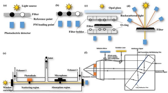 The filter-based technique measures the babs of deposited PM, while the in situ technique measures the babs of PM in suspension. The in situ technique offers advantages such as real-time and continuous measurement, without interference from loading and filter scattering effects. However, it does not account for the bias of non-BC components on babs and is susceptible to interference from gas components and water vapor [,]. Common in situ techniques include using a Photoacoustic spectrometer (PAS, company: http://www.dropletmeasurement.com, accessed on 28 November 2023), Photo thermal interferometry (PTI, company: https://haze.si/, accessed on 28 November 2023) (Figure 3f), and the Differential Method.