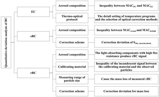 The discrepancy in EC measurement primarily arises from the selection of thermo-optical protocols and the interference caused by non-BC chemical components. This bias in EC quantification, particularly due to PC, can be effectively mitigated through solvent extraction. The primary uncertainty of eBC measurement is the aging of BC, which primarily manifests as a deviation in the babs measurement caused by changes in the original MAC. Additionally, filter-based instruments exhibit strong sensitivity towards the choice of babs correction scheme, necessitating the use of a scheme that precisely corresponds to the PM type. To enhance the consistency of optical instrument detection and minimize the impact of BC aging on babs measurement, heating the sample can be employed. The quantitative technique for rBC offers the highest sensitivity and least uncertainty at present. However, its particle size detection range (1 μm) limits its suitability for observing BC mass above the submicron scale. Furthermore, the PM type is susceptible to correction materials (e.g., SP2) and mass loss correction schemes (e.g., SP-AMS). Therefore, it is crucial to accurately identify the PM type and subsequently select appropriate correction materials and mass loss correction schemes. Subsequently, we will conduct an inter-comparison of the three aforementioned quantitative techniques, combined with previous studies, to characterize the variations in their response to different observable conditions and analyze the underlying reasons.
