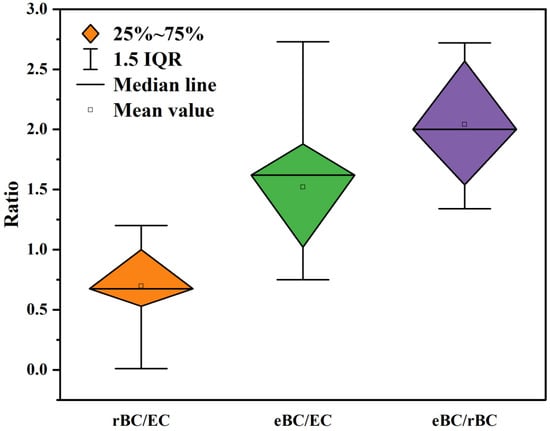 The aforementioned research indicates that the disparity between eBC and EC is directly related to the presence of non-BC constituents, such as organic matter and secondary inorganic salts, in aerosols. This discrepancy becomes more pronounced during periods of intense pollution. For instance, Jeong et al. [] conducted a study on smoke particles before and after a forest fire, utilizing the TOA and the AE. They observed a considerable increase in OC, EC, and eBC by factors of seven, nine, and four, respectively, following the forest fire. Moreover, the eBC/EC ratio exhibited a sharp decline from 3.61 to 0.35 post fire. This change was attributed to a significant rise in atmospheric OA and moisture induced by wood combustion, consequently altering the MAC of smoke particles. Patterson and McMahon [] documented that the actual MAC at 632.8 nm of smoke from fires ranged from 0.04 to 1.00 m2/g, which is notably smaller than the value of 16.6 m2/g at 680 nm recommended by the manufacturer used by Jeong et al. []. As a result, an underestimation of eBC occurred. Reisinger et al. [] investigated the discrepancy between eBC and EC in ambient samples collected in Vienna, Europe, along with the impact of BrC on the comparability of eBC and EC measurements. Their findings revealed that eBC measured using MAAP exceeded ECTOT-NIOSH values by 172.79%. The underestimation of ECTOT-NIOSH arises from excessive Tpeak, whereas the overestimation of eBC results from the presence of non-BC light-absorbing constituents, such as BrC. This is most evident in the aerosols affected by biomass fuel heating in winter. Specifically, the difference between eBC and EC increases as the contribution of BrC increases. Zhi et al. [] investigated the EC and eBC levels during the transition from clean days to heavy haze in Shanghai, using TOA and AE. They found that the eBC/EC ratio varied under different weather conditions. During clean weather, the eBC/EC ratio was 0.92, but it increased to 1.88 during periods of heavy haze. This increase can primarily be attributed to elevated PM concentrations, which enhance the internal mixing of BC with other species such as sulfates, nitrates, ammonium salts, and SOC. Consequently, this overestimates the eBC values. Based on the aforementioned studies, eBC and EC cannot be used interchangeably, particularly in situations where BC has undergone significant aging and pollution sources are diverse. While there is no fixed size relationship between eBC and EC, the general trend is that eBC/EC > 1.0 in most cases [,,,]. The degree of difference between the two parameters mainly depends on non-BC chemical composition, BC mixing state, and BC aging degree.
