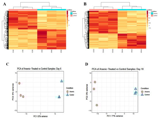 To identify the signaling pathways responsible for the impairment of key markers involved in motor neuron differentiation, we performed RNA sequencing and pathway analysis in D6 NEPs and D18 early MNs. Differential expression analysis suggests that arsenic exposure is driving gene expression changes in both D6 NEPs (Figure 7A) and D18 early MNs (Figure 7B). Principal component analysis (PCA) confirms these results showing that cells exposed to arsenic express different genes than control samples at both time points (Figure 7C,D). For instance, control and arsenic samples are heavily separated along the x-axis (PC1), which accounts for 82% of the variation in D6 NEPs (Figure 7C) and 77% of the variation in D18 early MNs (Figure 7D), respectively.