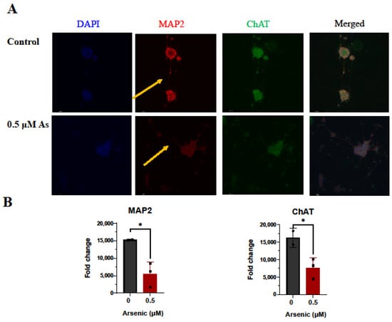 The effects of arsenic exposure on protein expression of the neuronal marker MAP2 [,], and cholinergic marker ChAT were investigated by immunohistochemistry in D18 early motor neurons. While no differences in MAP2 and ChAT protein expression were noted, fewer MAP2+ neuronal extensions can be seen in arsenic-exposed D18 early MNs (arrows; Figure 9A,B). However, in D28 mature MNs, protein expression of MAP2 and ChAT in the cell body of was significantly downregulated in arsenic-exposed samples by 2.8- and 2.1-fold, respectively (Figure 10A,B).
