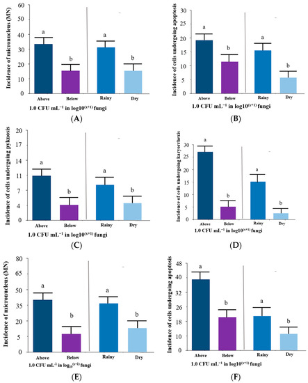 According to AnvariFar et al. [42], cells in apoptosis (cell death), pyknosis and karyorrhexis are indicative of self-destruction of cells that aim to maintain the homeostasis of the organism and occur in a programmed manner. These three mutations showed a higher incidence in conditions with mycotoxigenic fungi and in the rainy season. Therefore, there was a stimulus for pathological processes in the organism. Karyorrhexis is a type of cell mutation that destructively fragments the erythrocyte nucleus; its chromatin is irregularly distributed throughout the cytoplasm, causing cell death. It is usually preceded by pyknosis and followed by karyolysis and can occur as a result of programmed cell death, senescence, or necrosis [43].