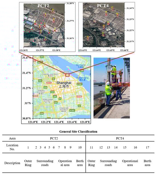 Shanghai Waigaoqiao Port, one of the world’s busiest container hubs, contributes substantially to the local economy through its vast container throughput. However, the associated port activities—including container handling, storage, and vehicular movements—pose considerable air quality challenges for the surrounding communities and the broader urban environment. The local authorities have shown significant concern about the emissions from the terminal, leading to the establishment of two regulatory AQMSs within the terminal area to provide highly accurate pollution monitoring. However, due to the spatial variability of pollutants within the terminal, there can be significant differences in pollution concentrations within a few meters’ distance. Additionally, pollution emissions from fuel combustion, especially from mobile traffic sources, often occur at high concentrations within minutes or even seconds. However, the time resolution of the FEM pollutant analyzers employed by the AQMSs is typically 1 h, which is insufficient to capture rapid changes in pollutant concentrations. Therefore, in this study, we deployed 17 additional sensors as a supplement to the AQMSs, distributed across four different functional zones within PCT2 and PCT4, to enhance high spatiotemporal resolution monitoring of NO and NO2 within the terminal.