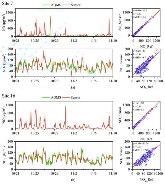 In this study, two sensors (site 7 and site 16) were deployed at the local AQMSs in PCT2 and PCT4, respectively. Figure 2 presents a time-series comparison of NO and NO2 measurements from these colocated sensors and the AQMS reference data, with sensor data aggregated into 1 h intervals to align with the FEM gas analyzer’s resolution (Model 42i, Thermo Fisher Scientific, Waltham, USA). The sensors demonstrated strong alignment with the reference measurements, capturing large-scale variations effectively, with peaks reaching around 1000 μg/m3 for NO and 160 μg/m3 for NO2.