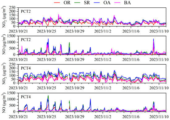 Figure 3 presents the time series for NO and NO2 concentrations across the four functional zones in PCT2 and PCT4, from 21 October to 10 November 2023. Consistent with the figure, NO levels at PCT2 and PCT4 showed similar fluctuating patterns, with notable peaks in the surrounding roads (SRs) and operational areas (OAs), suggesting these zones are hotspots for emissions, likely due to heavy-duty diesel truck activity and intensive cargo operations. A particularly severe pollution episode occurred between October 25 and 28 October, and on 9 November, with 25 October exhibiting exceptionally high NO values exceeding 1000 µg/m3 in the SRs and OAs of both terminals. This indicates the substantial impact of primary emissions from vehicular and ship activities.