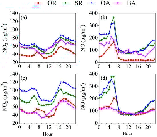 Diurnal patterns of NO2 and NO in four functional zones in (a,b) PCT2 and (c,d) PCT4.