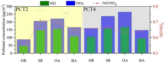 Figure 6 shows the average concentration of NO and NOx, along with the NO/NOx ratio in four functional zones in PCT2 and PCT4 during the campaign period. PCT2 and PCT4 exhibit a similar pattern, with the average concentrations of NOx in the four functional zones ranked as follows: OA > SR > BA > OR. Consider the following aspects: firstly, the OA is the most active zone within the terminal, involving cargo handling and vessel operations, resulting in higher emissions and consequently the highest concentration of NOx. Secondly, the SRs bear a significant volume of traffic, especially freight vehicles and heavy trucks, which are important sources of NOx emissions from vehicle exhaust. Therefore, the NOx concentration is also higher in the vicinity of these roads. In the BAs, the concentration of NOx is influenced by the exhaust emissions from trucks entering and leaving the berthing area. Lastly, the OR is an area that is further away from the main emission sources and has a more open space, allowing for better air dispersion. Furthermore, for the high-concentration functional areas of the OAs and SRs, the NOx concentration in PCT2 is lower than in PCT4, but the NO/NOx ratio is higher in PCT2. This can be explained by the fact that although the NOx emissions from the OA and SR in PCT2 are lower than in PCT4, the conditions for dispersion are relatively poor, resulting in a lower conversion of NO to NO2. It is worth noting that in PCT2, both the average NOx concentration and the NO/NOx ratio in the OR are the lowest.