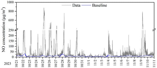 Figure 7 illustrates the separation of the background signal from the monitoring data using the lowest percentile method, taking NO measurements at monitoring site 1 as an example. Frequent high spikes were observed in the sensor-collected NO data, with the highest concentrations reaching up to 900 μg/m3, which are attributed to emissions from non-continuous mobile emission sources. However, the concentration range of the baseline signal (Figure 7, blue curve) was between 0 and 31 μg/m3. Lower NO baseline concentrations were observed during the daytime, possibly due to the influx of cleaner air from the free troposphere, which typically has low NO concentrations, mixing into the boundary layer. In contrast, the stable nighttime boundary layer trapped pollutants near the surface, leading to higher NO concentrations during the night. Additionally, the daytime regulation of diesel trucks in the city was also a contributing factor to the lower baseline signal during the day. This study demonstrated that high-resolution data collected from sensors can identify different regional influences and local contributions without making prior assumptions about the emission inventories of the deployment location.