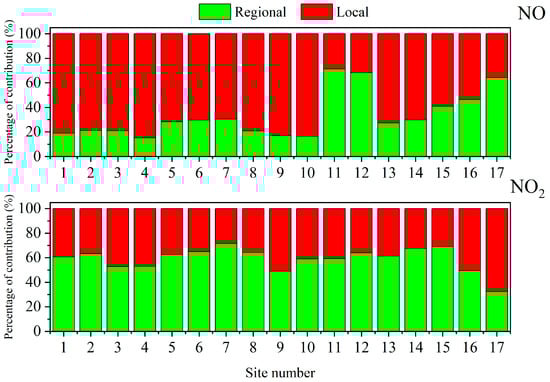 Histogram of percentage contribution of local emission (denoted in red) and regional baseline (denoted in green) for NO and NO2.