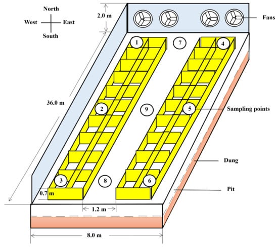Considering the distribution of China’s pig farming industry, which exhibits regional variations in productivity levels due to inherent limitations and growth potential [], Hebei Province stands out as a critical region, playing a pivotal role in the nation’s pig industry. Over the past seven years, it has consistently accounted for approximately 5% of the country’s total pork production (China Statistical Yearbook, 2016–2023). Adopting typical fattening technologies and the representative pigsty planning and allocation strategies employed in this province embody the advancements made in China’s pig farming sector []. We randomly selected one of these farms to serve as a case study for our study. This study was conducted in a commercial enclosed fattening house located in Shijiazhuang City, Hebei province, China (east longitude 113°30′ to 115°20′, north latitude 37°27′ to 38°47′). The fattening house is oriented north–south with dimensions of 36 m × 8 m (Figure 1). The house has a tunnel ventilation system consisting of wet curtains and fans installed in the north- and south-end walls, respectively. A warm air stove was placed outside the house, and a windpipe system was used for heating in winter. There is a 1.2 m wide aisle in the middle of the house and 10 pens on the east and west sides, each of which housed 10–12 pigs, a total of about 250 fattening pigs aged from 120 to 160 days old and weighing approximately 80 kg. The feeding cylinder was mechanically operated daily by the farmer for pigs taking pellet feed at 6:00 am and 5:00 pm, and the health of herds was checked simultaneously. Fecal cleaning was performed daily at 3:00 pm.