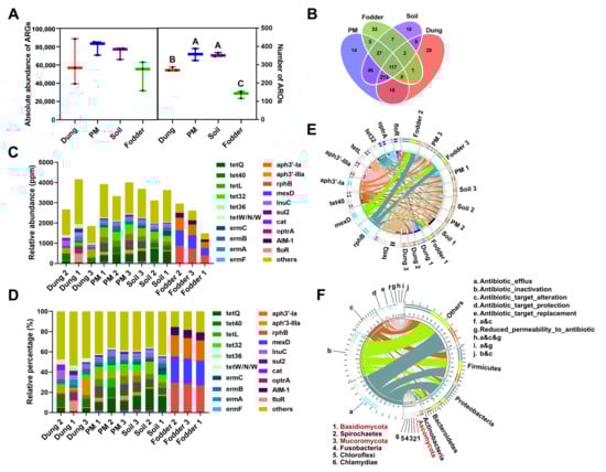 After a comprehensive genome-wide analysis of microbiota, including bacteria, eukaryotes, archaea, and viruses in four different vectors, we next focused on the ARGs. The absolute abundances of ARGs in four vectors are shown in Figure 7A on the left. No significant difference was found between the microbial gene numbers. Nevertheless, the number of antibiotic resistance ontologies (AROs) was consistent with the microbial gene number results (Figure 7A right). It was significantly higher in PM and soil than in dung and fodder (p < 0.01) and was lowest in fodder (p < 0.01). The Venn diagram shows the number of standard and unique AROs in four vectors (Figure 7B). A total of 117 common AROs were found in the four vectors. The number of unique AROs in fodder was the highest, with 33, followed by dung, with 28. The number of AROs unique to PM and soil was similar, with 14 and 10, respectively.