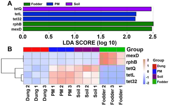 Five featured ARGs were analyzed. They are tetQ in soil, tetL and tet32 in PM, rphB, and mexD in fodder, respectively (Figure 8A). No featured ARGs were screened in dung. The heatmap also uncovered that the ARGs of mexD and rphB were abundant only in fodder samples. The tetracycline ARGs of tetQ, tetL, and tet32 were abundant in both PM and soil samples (Figure 8B). But it can still be seen that tetQ was more abundant in soil, while tetL and tet32 were more abundant in PM. Additionally, there are no featured ARGs that are abundant only in dung.