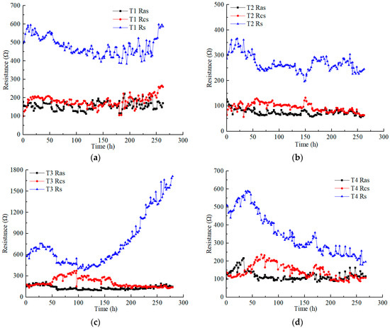 Figure 4 illustrates the variations in the anolyte resistance (), catholyte resistance (), and soil resistance () in each test under different applied voltages. Soil resistance is obviously higher than electrolyte resistance. The anolyte resistance was closer to or slightly lower than the catholyte resistance in each test. The anolyte resistance and catholyte resistance of each test ranged from 50 to 200 Ω, except the catholyte resistance of T3, which reached a higher value of nearly 400 Ω. The electrolyte resistance was affected by many factors, such as the contact area between the electrolyte and soil, the dosage and concentration of the electrolyte, and the conductivity of the contaminated soil (heavy metals concentration). However, in this experimental scheme, the aforementioned influencing factors constantly changed during the EKR treatment [30].