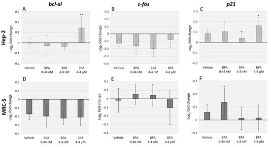 Quantitative real-time PCR (qRT-PCR) analysis of Hep-2 (A–C) and MRC-5 (D–F) cell lines after exposure to three different concentrations of Bisphenol A (BPA). The data represent the relative expression of the genes: bcl-xl (A,D), c-fos (B,E), and p21 (C,F). GAPDH and β-actin were used for normalization. The error bars represent the standard deviation between two independent treatments and three qRT-PCR replicates. Significant statistical values, which were compared with the vehicle (EtOH) and calculated with Student’s t-test, are illustrated as: * p < 0.05 and ** p < 0.01.