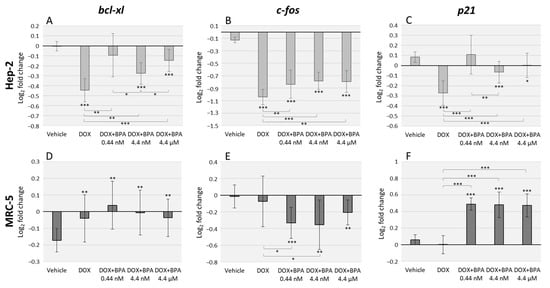qRT-PCR analysis in Hep-2 (A–C) and MRC-5 (D–F) cell lines after exposure to doxorubicin (DOX) alone and in combination with three different environmentally relevant concentrations of BPA namely 0.44 nM, 4.4 nM, and 4.4 µM. Data represent the relative expression for the genes: bcl-xl (A,D), c-fos (B,E) and p21 (C,F). GAPDH and β-actin were used for normalization. Error bars represent the standard deviation between two independent treatments and three qRT-PCR replicates. Significant statistical values, which were compared with the vehicle (EtOH) and calculated with Student’s t-test, are illustrated as: * p < 0.05, ** p < 0.01 and *** p < 0.001.
