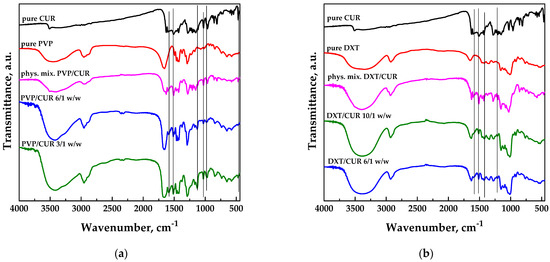 Figure 5b shows the infrared spectra relating to pure CUR and pure DEX, SAA co-precipitates obtained at different carrier/CUR ratios. The spectrum of pure dextran showed a broad band at about 3500 cm−1 due to O-H stretching vibrations, a band at about 2900 cm−1, which refers to C-H stretching, and partially overlapping bands at 1200–800 cm−1, associated with C-O-C absorptions [45]. Some characteristic bands of curcumin (highlighted with black vertical lines) could be observed in the SAA samples’ spectra and the physical mixture. However, a major correspondence with the polymer spectrum due to the higher amount of the latter one into the composite powders could be detected.