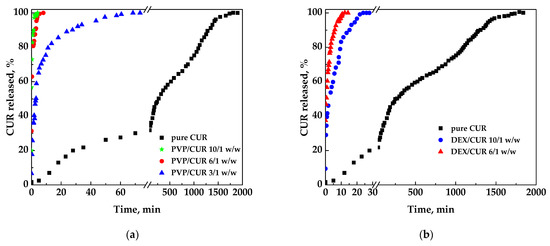 The dissolution profiles reported in Figure 7 were measured on curcumin in pure form or released from different coprecipitates to highlight the influence of the various carriers on the CUR dissolution rate.