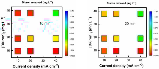 - Nevertheless, attention must be given to efficiency and energy consumption, in which case the operation at 10 mA cm−2, regardless of the initial Diuron concentration, becomes more attractive as it removes Diuron with the lowest applied charge and energy demand.