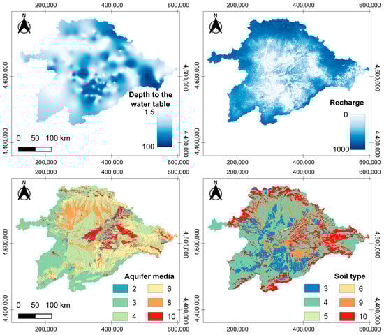 The classic DRASTIC approach considers seven input parameters, namely, depth to the water table (D), recharge (R), aquifer media (A), soil (S), topographic slope (T), impact of the vadose zone (I), and hydraulic conductivity (C) []. We used a modification of the original method that incorporates land use (L) as an additional input parameter [] because agricultural use was expected to be a driving factor explaining groundwater nitrate. All variables were compiled in map form into a QGIS 3 geographic database (Figure 2 and Figure 3). Some layers were subsequently reclassified based on DRASTIC’s original categories, while others were employed with the raw values, specifically depth to the water table, recharge, and topographic slope (Table 1). Layer weight was left as the parameter for machine learning algorithms to optimize.