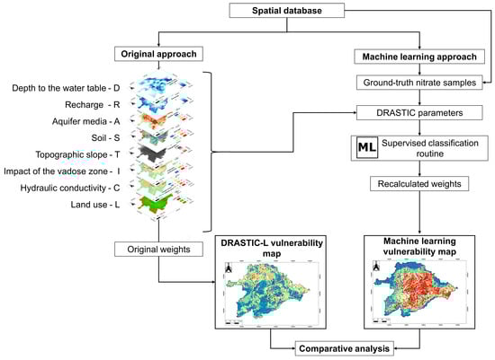 By definition, groundwater vulnerability is constrained by spatially distributed variables. Thus, the outcomes of vulnerability studies are generally presented as maps [,]. A recurring issue with index-based methods is how to assign coefficients to each governing parameter so as to reflect spatial variability. In this regard, it is sometimes pointed out that DRASTIC can be used without giving due importance to validation, which may bring its outcomes under scrutiny []. The advent of machine learning (ML) techniques represents a two-fold advantage in terms of enhancing the credibility of vulnerability maps. For one, machine learning allows new ways to infer groundwater-related variables by training artificial intelligence algorithms within GIS environments []. This means that weights can be optimized on ground truth. Furthermore, the process of training supervised learning algorithms on contamination data contributes to improving the credibility of the outcomes.
