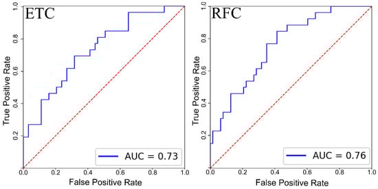 Figure 5 shows the area under the curve results for the best-performing models. The best performance was obtained by the Random Forest and ExtraTrees classifiers. Area under the curve scores of 0.76 and 0.73 for RFC and ETC, respectively, can be considered a measure of a reasonable predictive capability by these algorithms. The DTC, ABC, and GBC models show raw test scores below 0.67. The best-performing algorithms were also selected based on the F1 score values for both classes since it was observed that F1 values for the positive class were systematically lower than for the negative class. The RFC and ETC F1 scores exceeded those of the other algorithms, which barely reached 0.45, while these models exceeded 0.50.