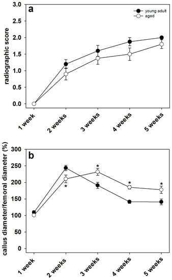 (a) Analysis of the radiographic score at 1, 2, 3, 4 and 5 weeks after fracture in young adult (black circles, n = 10) and aged (white circles, n = 10) CD-1 mice (Mann–Whitney U test used at 1, 2, 3, 4 and 5 weeks). (b) Analysis of the callus diameter/femoral diameter (%) at 1, 2, 3, 4 and 5 weeks after fracture in young adult (black circles, n = 10) and aged (white circles, n = 10) CD-1 mice (Mann–Whitney U test used at 1 week, Student’s t-test used at 2, 3, 4 and 5 weeks). Means ± SEM; * p < 0.05 vs. young adult.