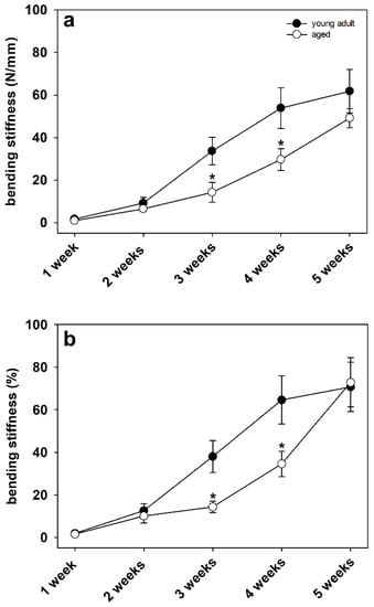 Biomechanical analysis of the bending stiffness of fractured femora revealed a significantly decreased bending stiffness at 3 and 4 weeks after fracture in aged animals when compared to young adult mice (Figure 4a,b). This decreased bending stiffness indicated an impaired quality of newly formed bone as well as a deceleration of fracture healing in aged animals. Of interest, the significant differences were observed when comparing the absolute bending stiffness data (Figure 4a) as well as when comparing the relative (to nonfractured contralateral bone) bending stiffness data (Figure 4b). In contrast, at 1, 2 and 5 weeks after fracture, we observed no significant differences in the absolute and relative bending stiffness data of the fractured femora between the two study groups (Figure 4a,b).