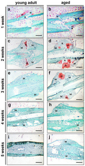 (a–j) Representative histological images (Safranin-O-staining) of fractured femora at 1 (a,b), 2 (c,d), 3 (e,f), 4 (g,h) and 5 weeks (i,j) after fracture in young adult (a,c,e,g,i) and aged (b,d,f,h,j) CD-1 mice (ct: cartilaginous tissue, ft: fibrous tissue, bt: bone tissue, cb: cortical bone). Scale bars: 1 mm.